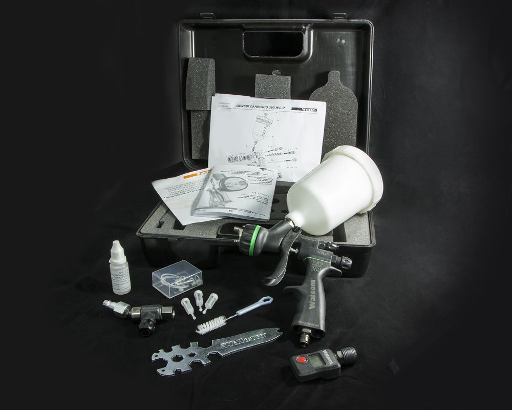 Краскораспылитель Walcom Genesi CARBONIO 360 HVLP предназначен для нанесения 1К базовых эмалей на сольвентной или водной основе. Может также использоваться для нанесения 2К акриловых, полиуретановых, полиэфирных и других видов эмалей и лаков невысокой вязкости.